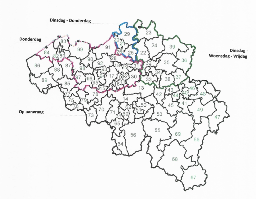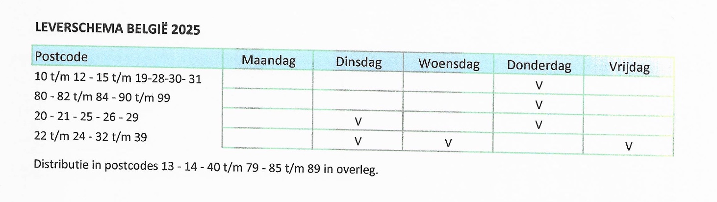 Iedere woensdag komt Coolrunnings uw bestelling bij ons ophalen. Bekijk in volgend schema op welke dag Coolrunnings jouw bestelling zal leveren.